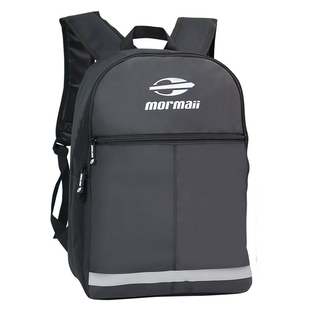 Mochila Mormaii com alças acolchoadas, alça manual reforçada, costas acolchada reforçada, costura dupla reforçada e etiquetas personalizadas.