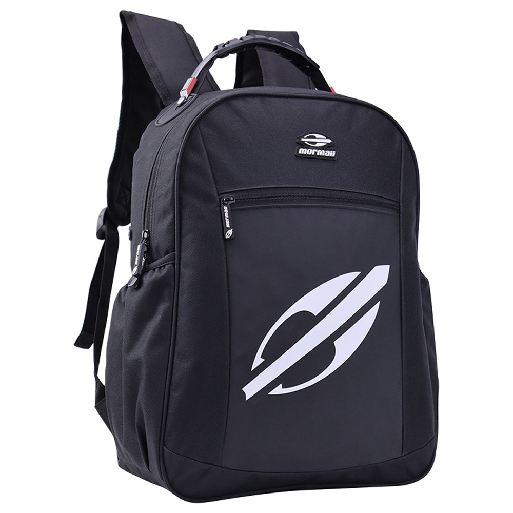 Mochila Mormaii com alças acolchoadas, alça manual reforçada, costas acolchada reforçada, costura dupla reforçada e etiquetas personalizadas.