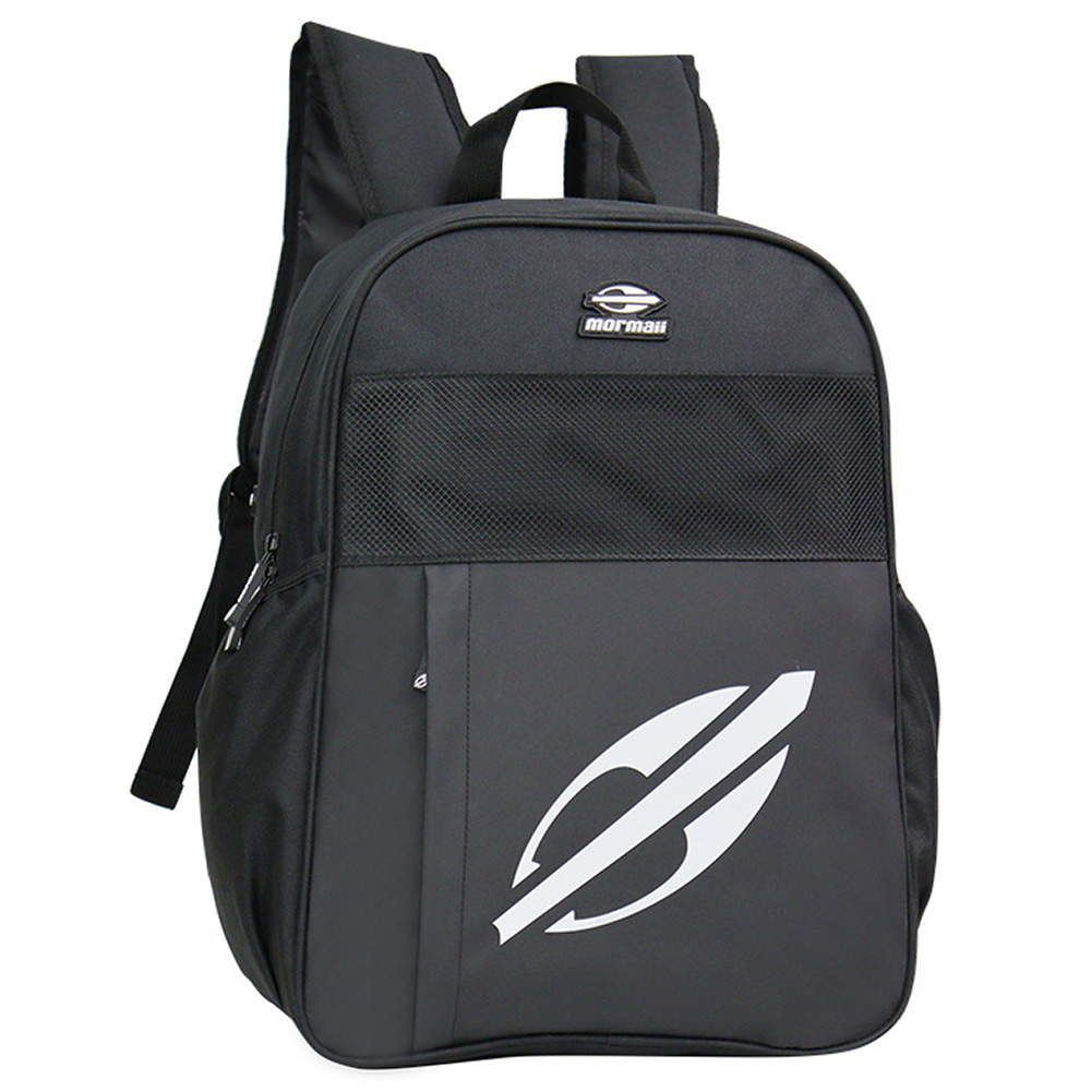 Mochila Mormaii com alças acolchoadas, alça manual reforçada, costas acolchada reforçada, costura dupla reforçada e etiquetas personalizadas.