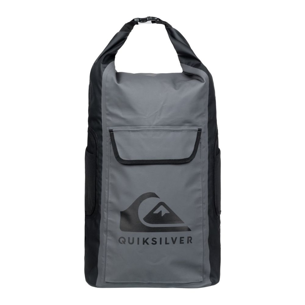 Mochila saco, com tecido de poliéster com costuras seladas, compartimento principal grande, com fechos na parte superior em formato de rolo, bolsos laterais e um frontal crealizado com lapela.