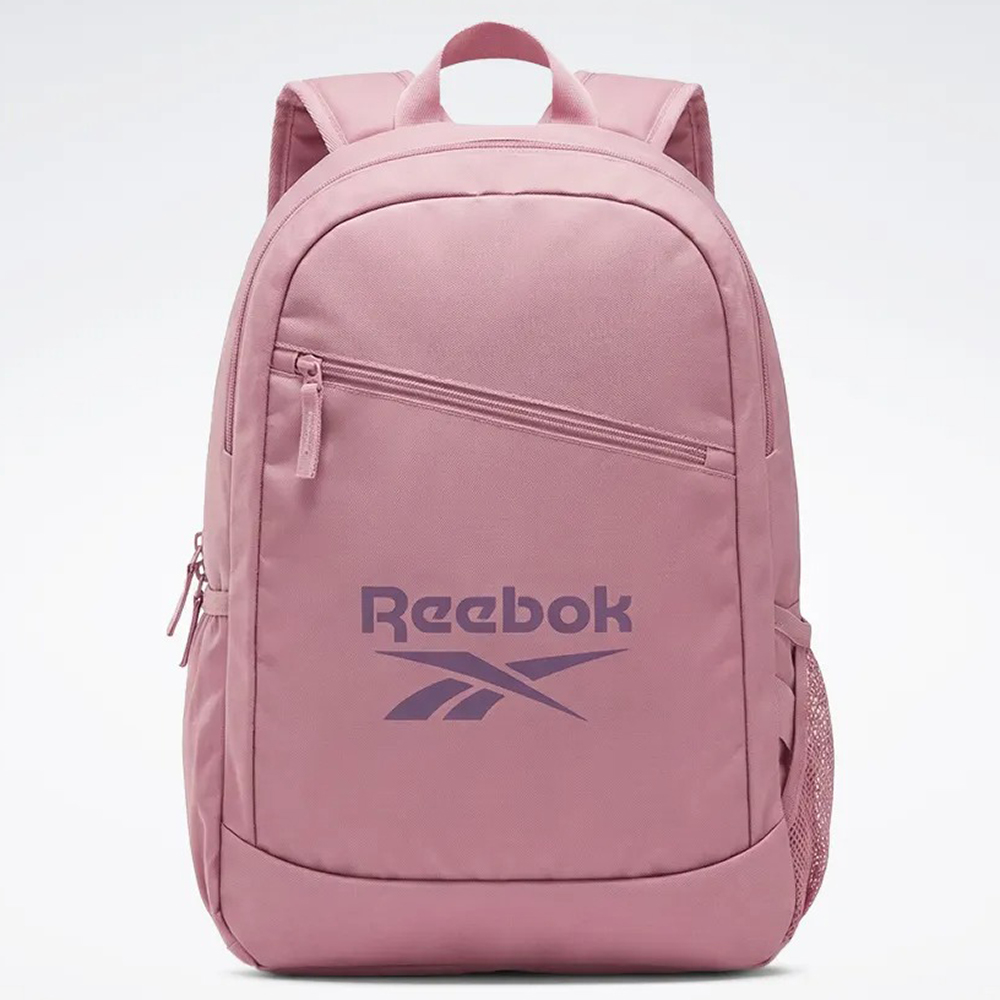 Mochila Reebok com compartimento principal, compartimento na parte frontal, estampa frontal, alças ajustáveis, espaço para laptop e etiquetas personalizadas.