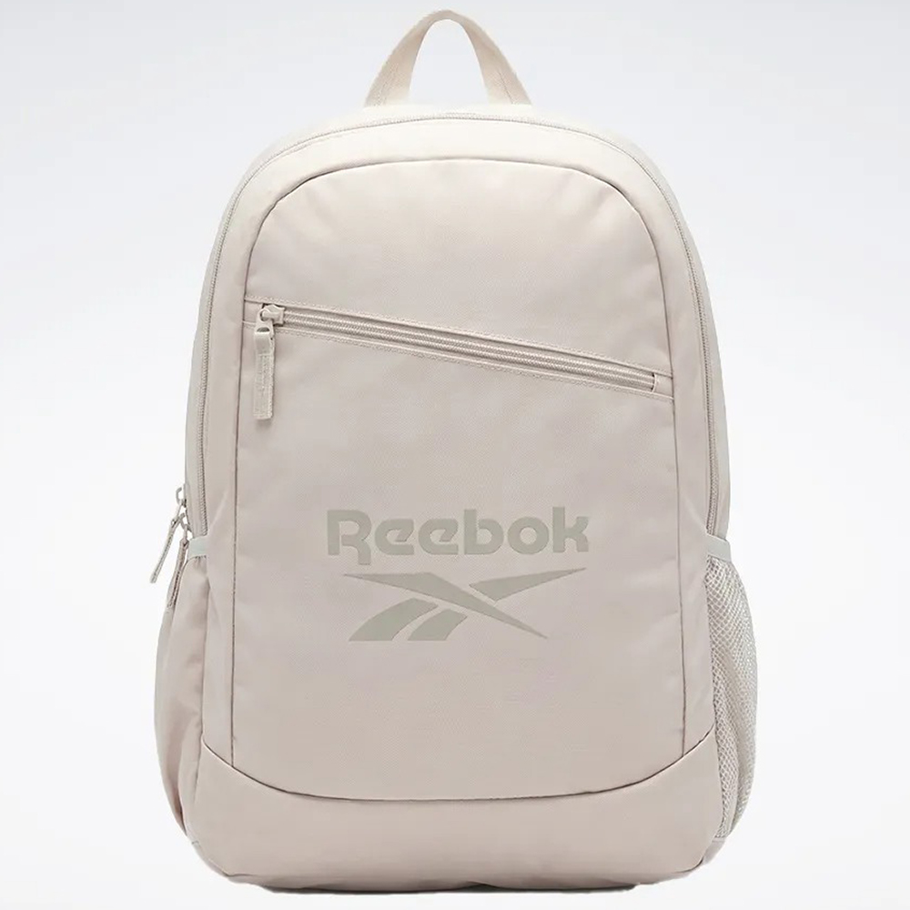 Mochila Reebok com compartimento principal, compartimento na parte frontal, estampa frontal, alças ajustáveis, espaço para laptop e etiquetas personalizadas.