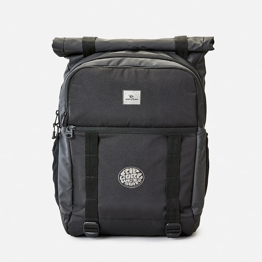 Mochila Rip Curl com seção para laptop, bolso par óculos de sol forrado de lã, sistema roll and clip, seção molhado/seco, compartimento dedicada para quilhas, bolso para garrafa de bebida, alças respiráveis e etiquetas personalizadas.