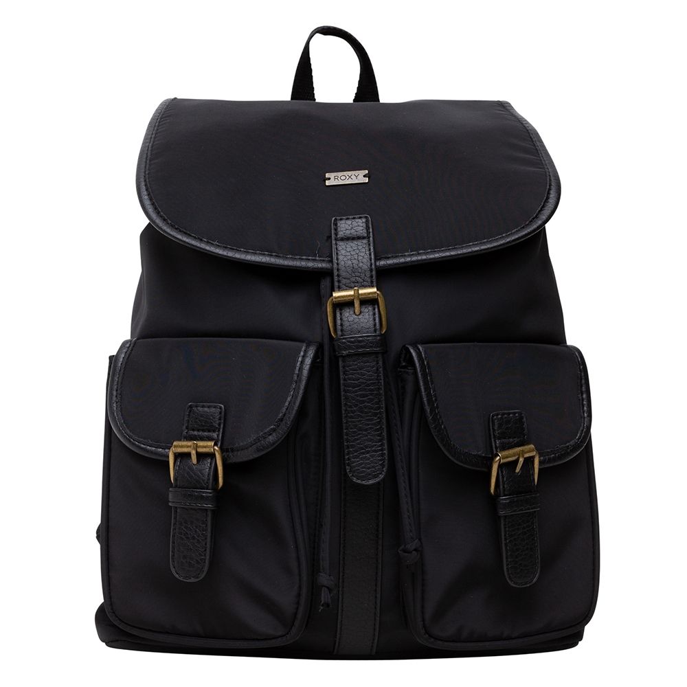 Mochila Roxy Feminina em tecido de náilon sólido com um compartimento principal com ilhós e cordão, dois bolsos frontais com botões de pressão e alças decorativas, bolso interno com zíper, alças ajustáveis e placa de metal ROXY.