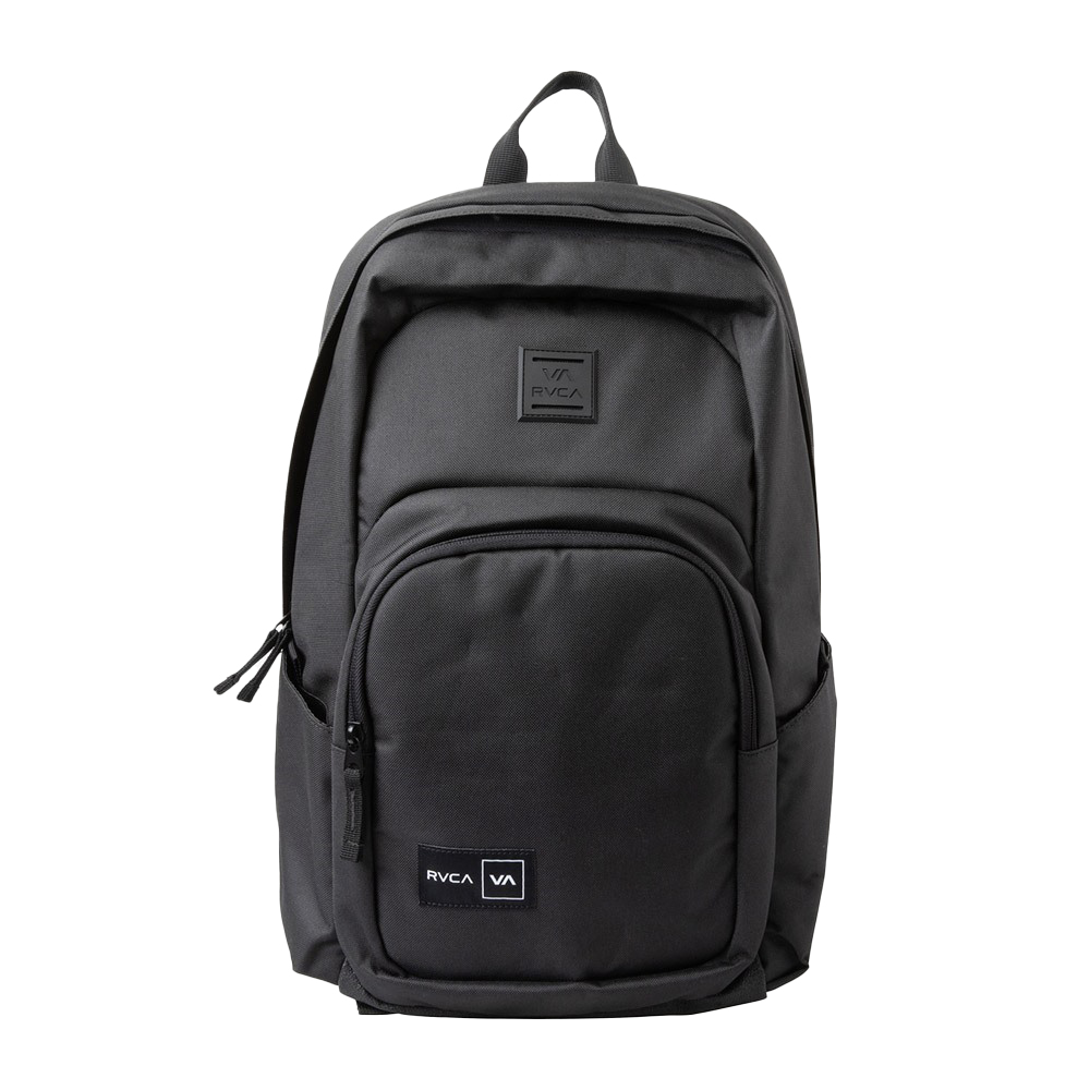 Mochila RVCA feita em tecido poliéster reciclado, dois compartimentos com zíper, compartimentos laterais em malha mesh, organizador interno do bolso frontal, alças de ombro ajustáveis, recorte de malha mesh traseira com arte rvca pespontada e etiquetas rvca va frente