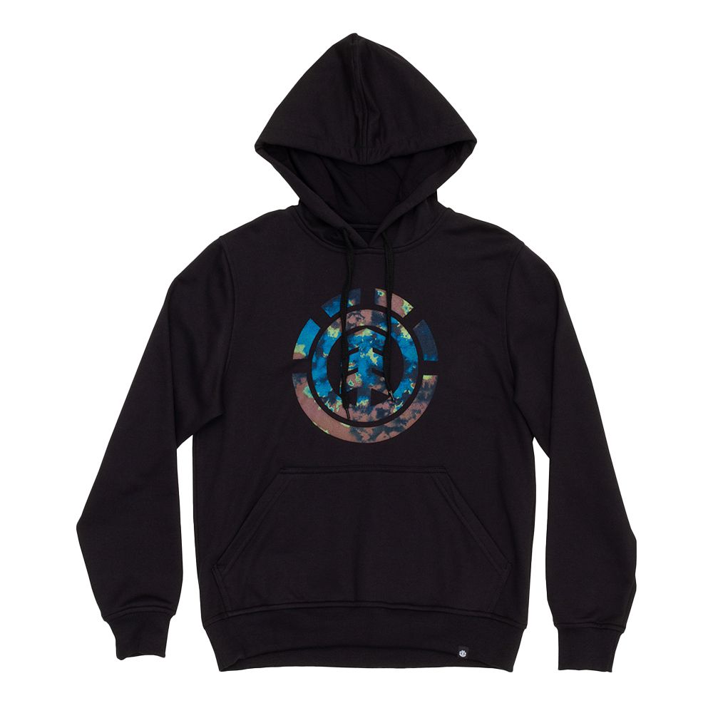 Moletom Element fechado com capuz e bolso canguru, estampa com logo em tie dye na frente e etiquetas personalizadas da marca.
