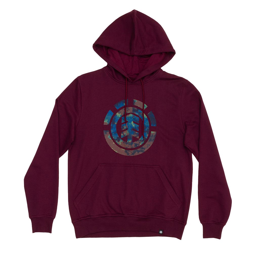 Moletom Element fechado com capuz e bolso canguru, estampa com logo em tie dye na frente e etiquetas personalizadas da marca.