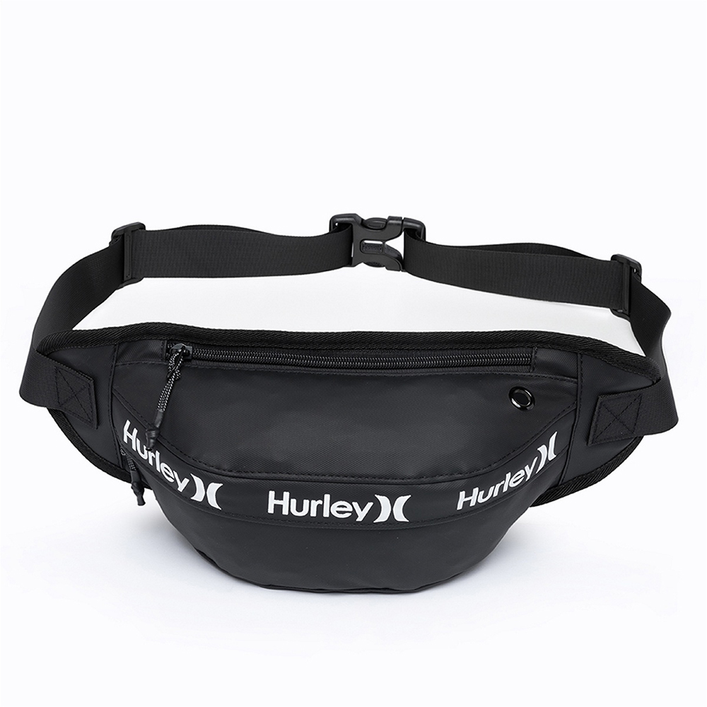 Pochete Hurley com compartimento principal, compartimento frontal, alça ajustável e etiquetas personalizadas.