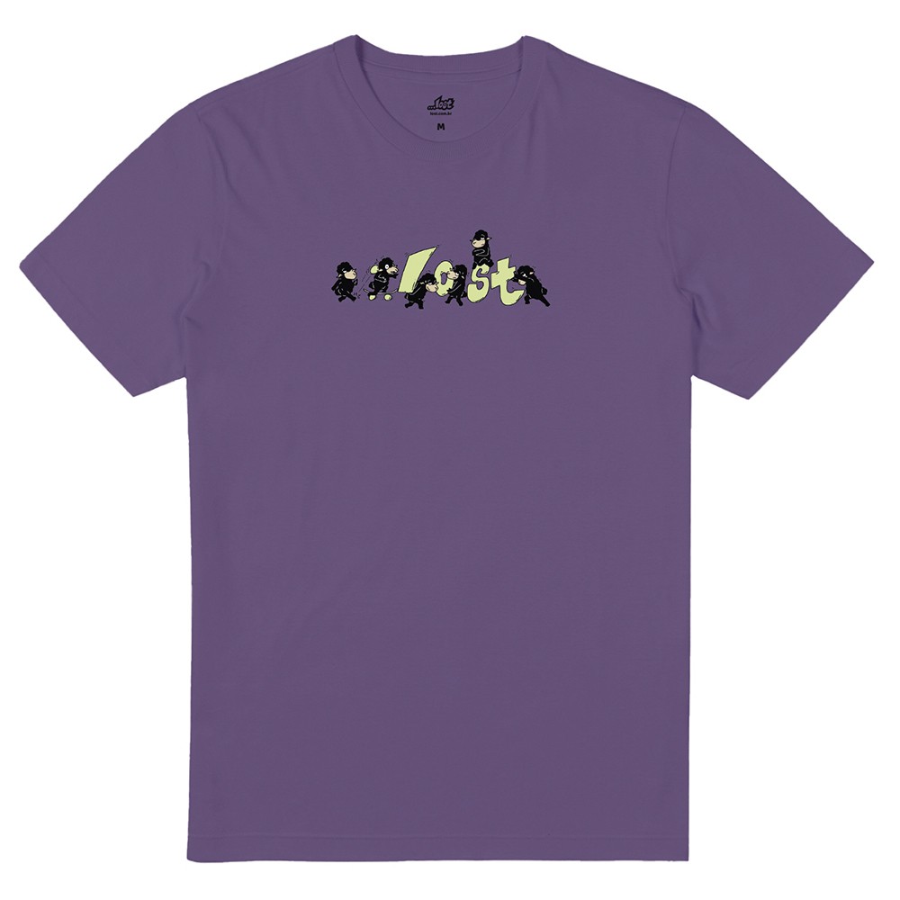 Camiseta LOST com meia malha penteada, fio 30/1, silk frontal, modelagem regular e etiquetas personalizadas.