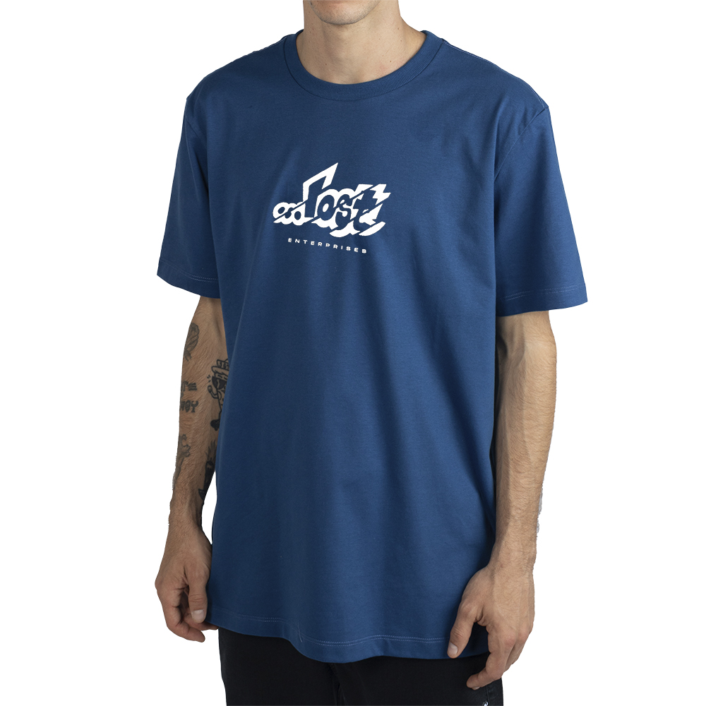 Camiseta LOST com tecido meia malha 30/1, modelagem regular, silk frontal e etiquetas personalizadas.
