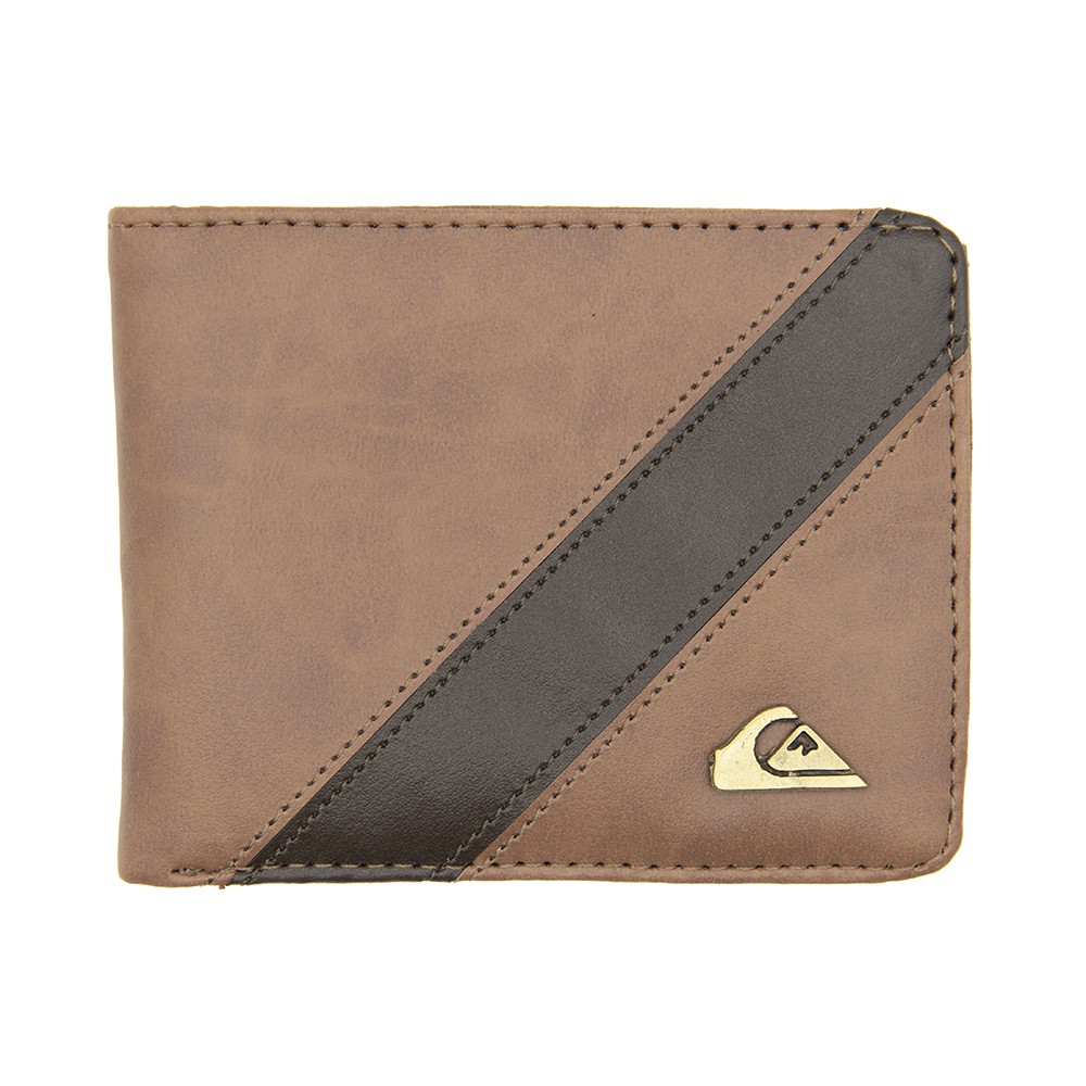 Carteira Quiksilver com tecido de manda PVC, cantos arredondados, recorte diagonal no painel frontal, aplicação de placa no canto do painel frontal, parte interna com moedas de um lado com fechamento de zíper e puxador, do outro, três aberturas para cartões, além de uma aplicação de alta frequência da marca.
