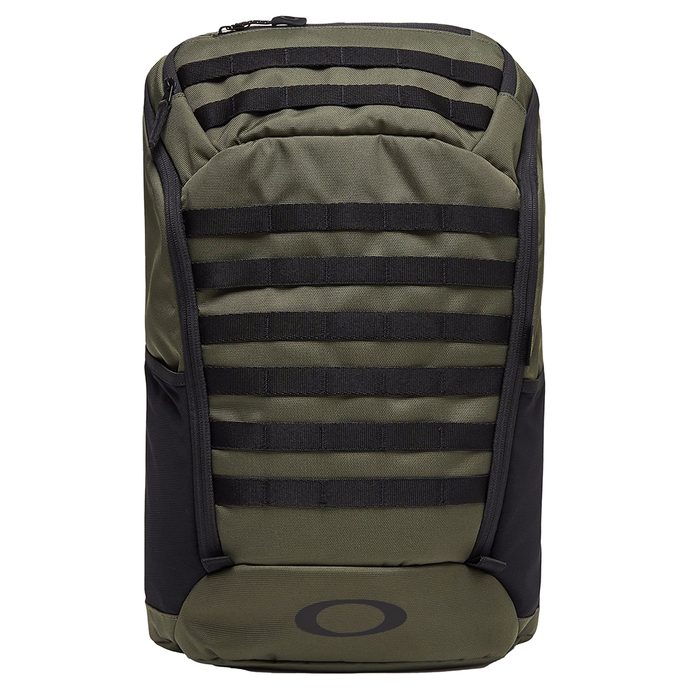 Mochila Oakley com tecido cordura, resistente à água, cinta horizontal no peito com ajuste, bolso frontal com zíper abertura total, bolso para óculos dedicado com microfibra e zíper, alças de ombro ajustáveis e acolchoadas em mesh, bolso para laptop organizacional do compartimento principal, diversos bolsos internos, bolso acolchoado para laptop e tablet, painel traseiro de malha acolchoada, painel na frente com passantes para bolsas adicionais, bolsos laterais em tela.