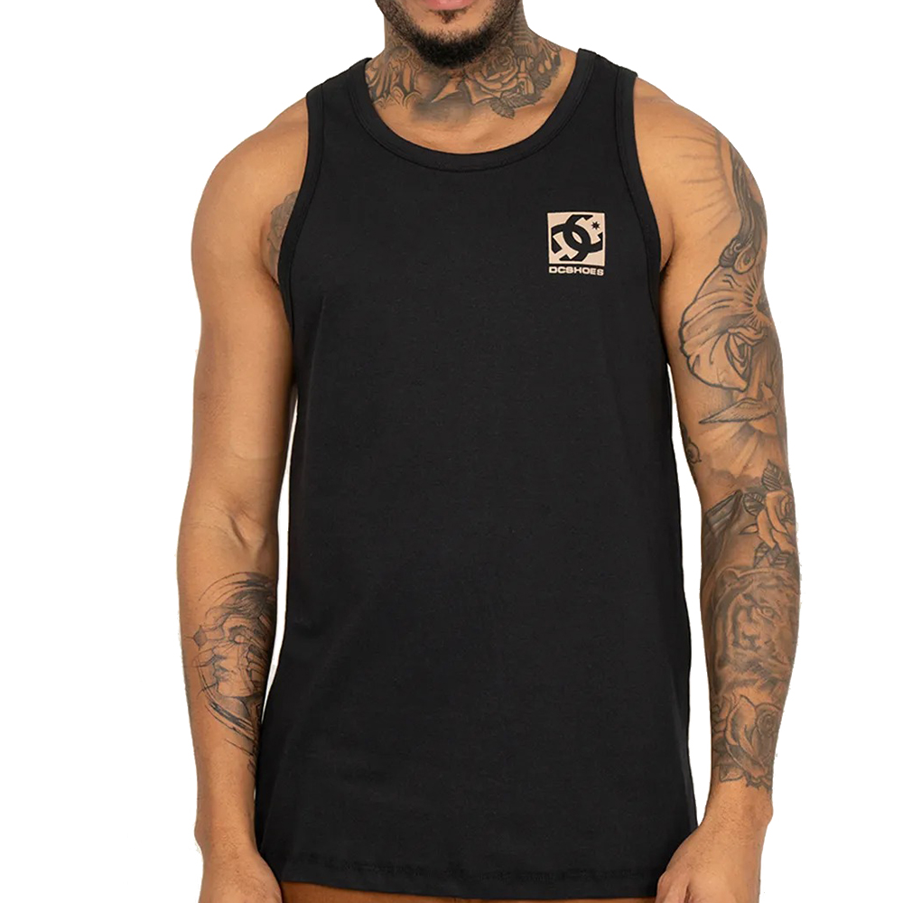 Regata Dc Shoes feita em modelagem regular, meia malha 30.1, estampa peito e etiquetas personalizadas.
