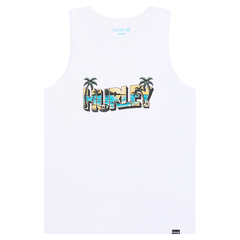 Regata Hurley feita em meia malha 30.1, gola rebatida, estampa localizada base d'agua e etiqueta clips ONE&ONLY na barra.