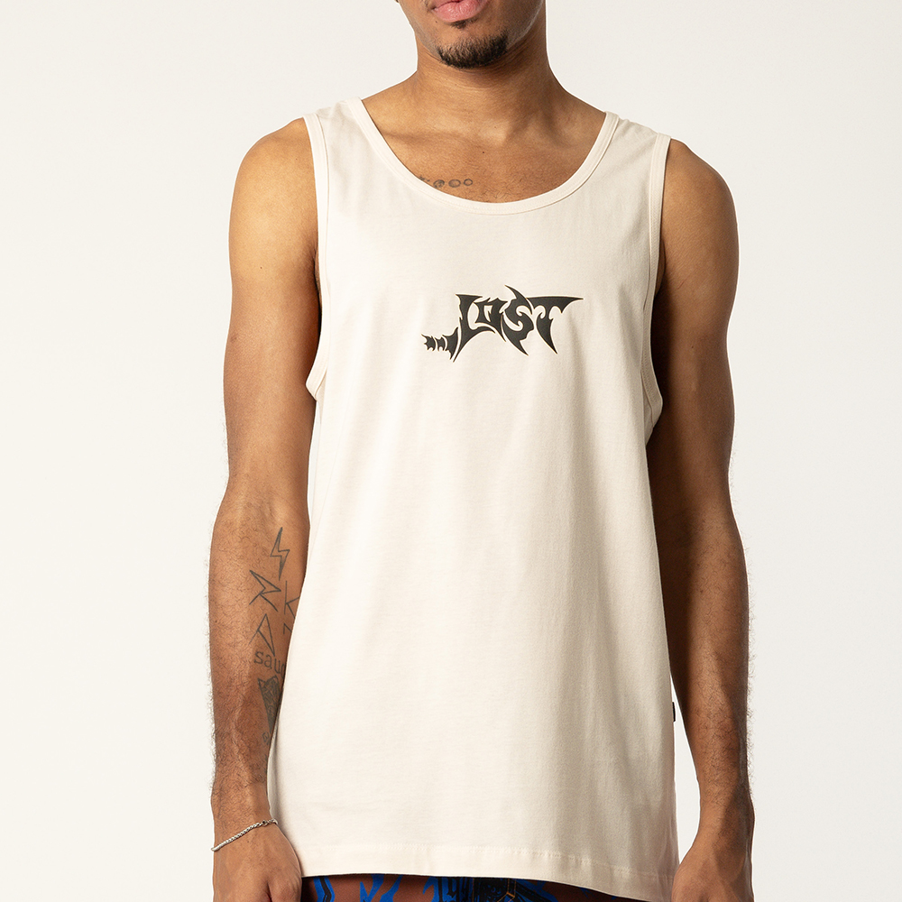 Regata Lost feita em modelagem regular, meia malha 30.1, estampa frontal e etiquetas personalizadas.