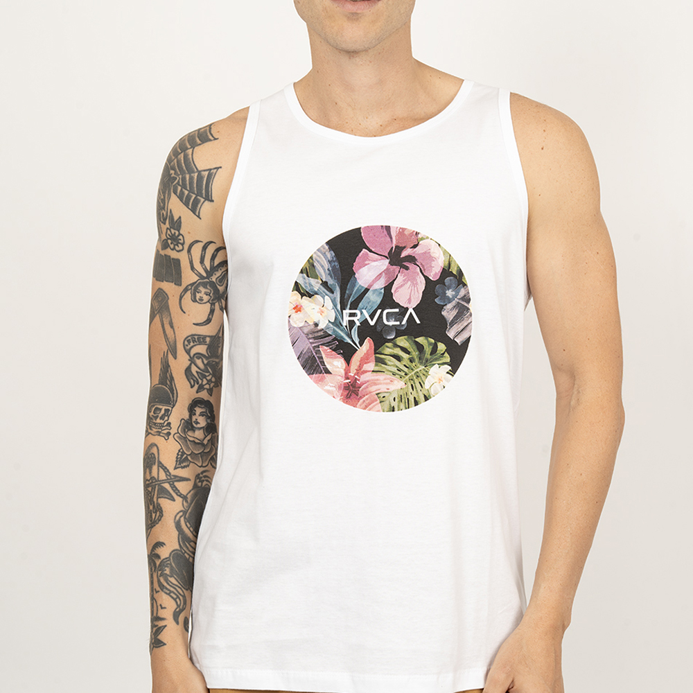 Regata Rvca feita em modelagem regular fit, meia malha 30.1 penteada, estampa frente, estampa interna de tamanho e tag personalizado.