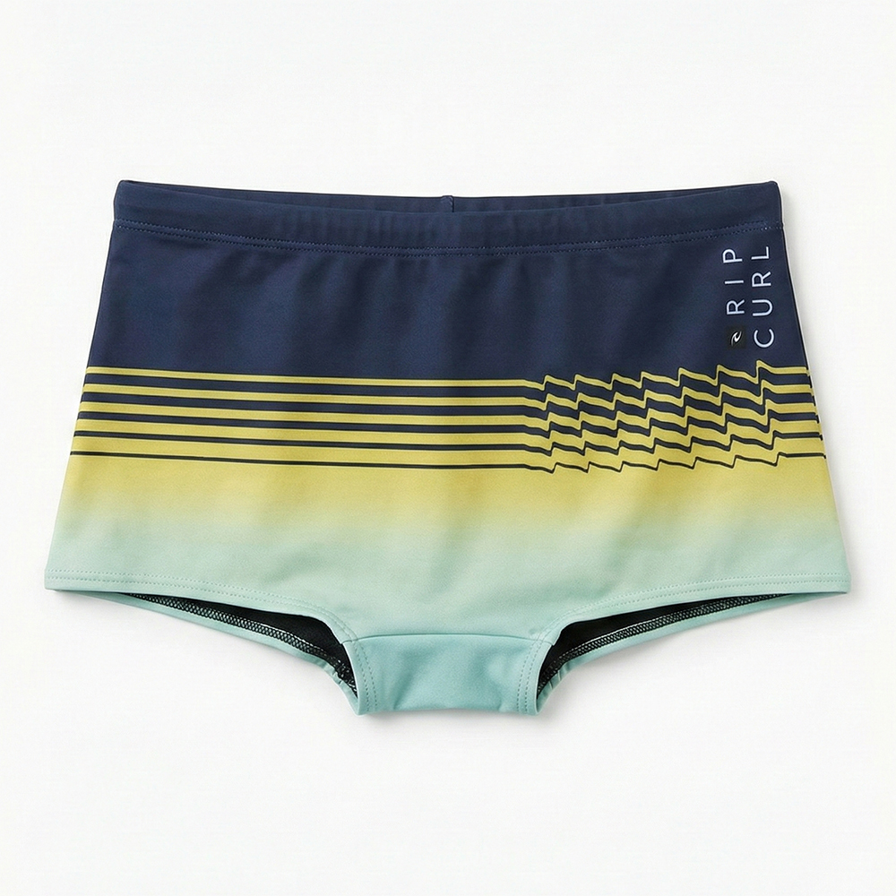 Sunga Rip Curl com proteção UV+50, cadarço personalizado, estampa full print, lateral 22 cm e etiquetas personalizadas.