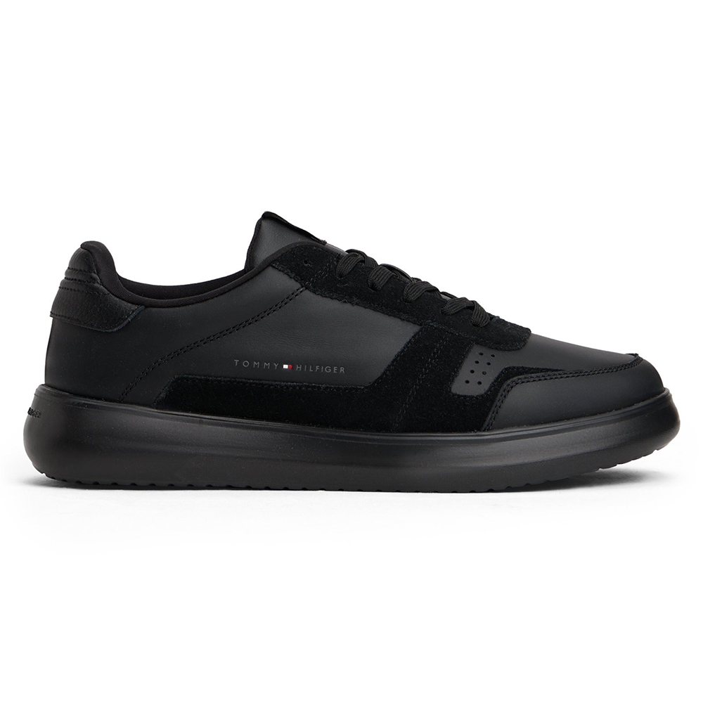 Seu visual apresenta cabedal em couro preto, com detalhes em preto no calcanhar e etiqueta em vermelho na língua, trazendo a identidade icônica da marca. Possui solado robusto em borracha preta, que garante excelente aderência e conforto ao caminhar. O logo Tommy Hilfiger aparece discretamente na lateral, reforçando o estilo autêntico da grife.