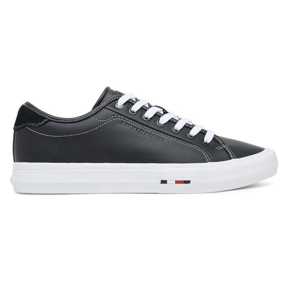 Seu design minimalista em couro preto é realçado por costuras contrastantes, solado branco em borracha vulcanizada e o icônico detalhe da bandeira Tommy Hilfiger na lateral. O forro interno macio e a palmilha acolchoada garantem conforto ao longo do dia, enquanto o solado com grip antiderrapante proporciona segurança ao caminhar.